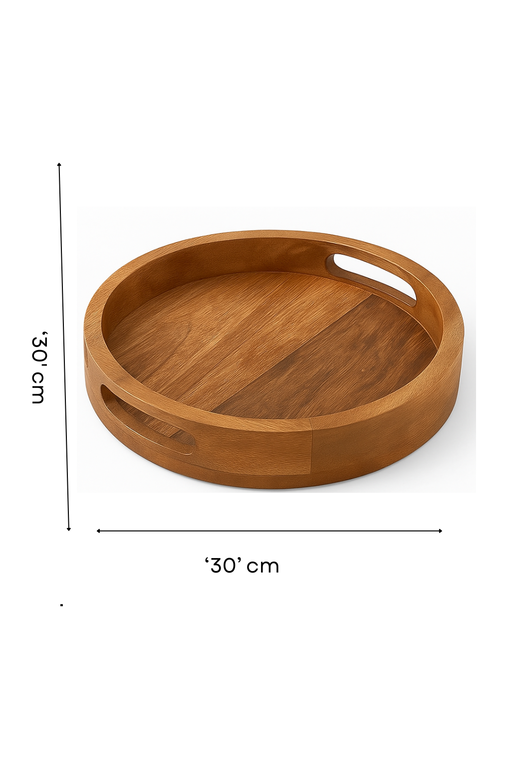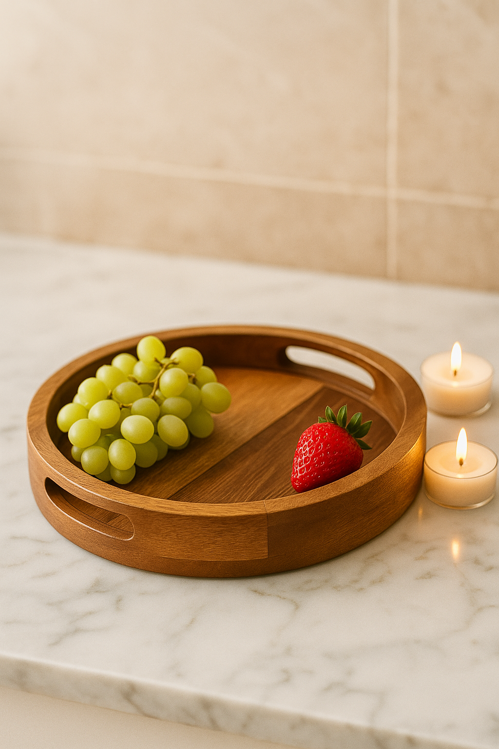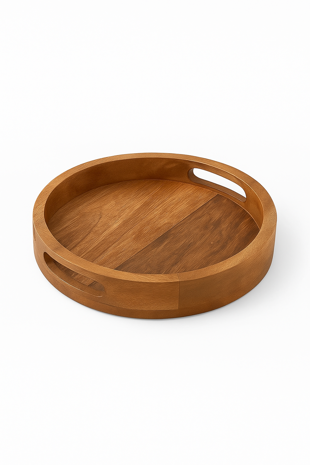 A premium round wooden serving tray crafted from high-quality natural wood, designed to bring elegance and utility to your kitchen and dining space. Its smooth polished surface, thick build, and raised edges make it perfect for serving snacks, tea, coffee, desserts, fruits, and more. The tray features a beautiful natural grain pattern that adds a luxurious touch to home décor, photography, and food presentation. Durable, food-safe, and stylish — an ideal piece for modern <warning name=’Holme’s’>homes</warning> and gifting